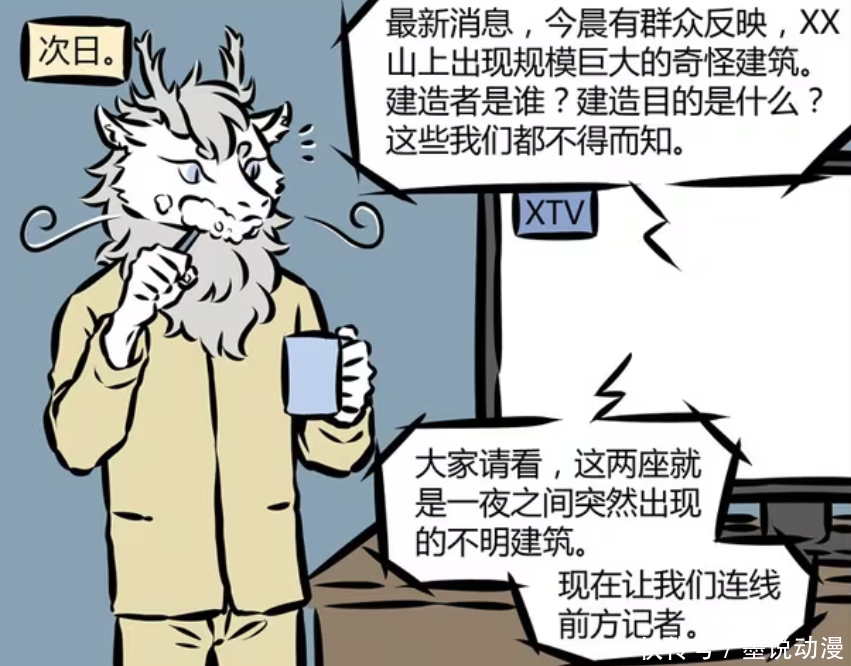 隔天早上,敖烈正常起来洗漱。此时电视上正在播放新闻。敖烈听到这样一则新闻,有群众反映,在某座山上出现了规模巨大的奇怪建筑物,那么建造者到底是谁?建造的目的又是什么?新闻主持人并不知道。记者还拍下了画面,这两座建筑物可以说是一夜之间突然出现。